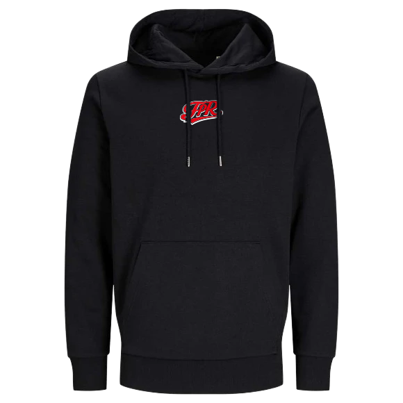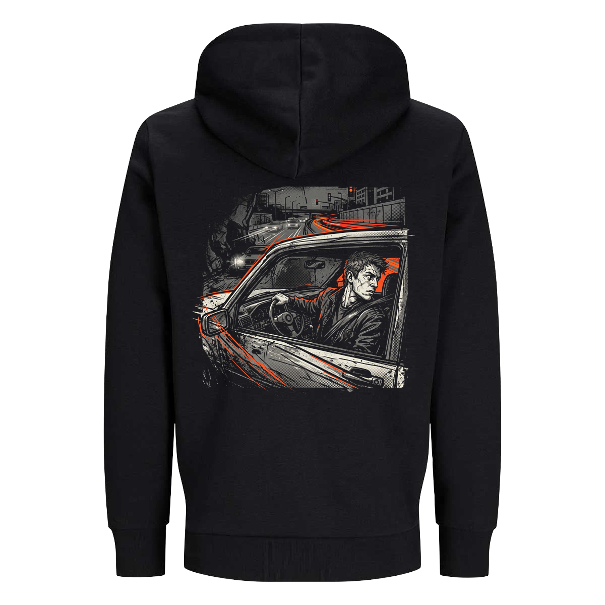 Vorne sitzt ein dezentes FPR-Logo auf der Brust. Auf dem Rücken sorgt das große Motiv mit Fahrer im Auto und urbaner Straßenszene für die eigentliche Wirkung. Die Kombination aus Schwarz, Grau und roten Akzenten macht den Hoodie stark, modern und sofort wiedererkennbar.